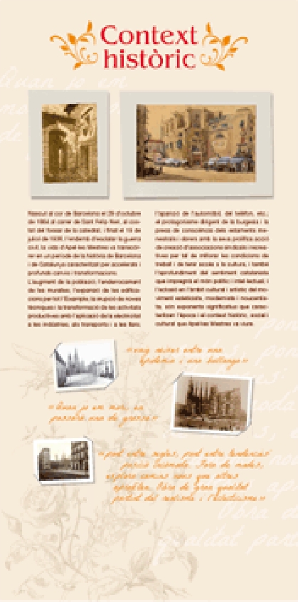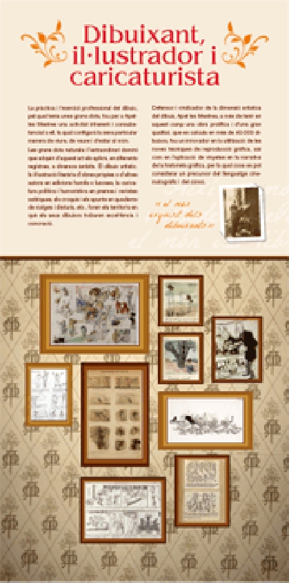 Consta de catorze apartats en disset plafons autoenrotllables que repassen les principals facetes artístiques i íntimes d’Apel·les Mestres: dibuixant, il·lustrador, músic, cançoner, col·leccionista, amic, tertulià, dramaturg, bibliòman, dissenyador gràfic, poeta, folklorista, figurinista, jardiner i viatger. S’il·lustren amb dibuixos, fotografies, retrats, caricatures, figurins, etc. i citacions d’Apel·les Mestres i altres autors.