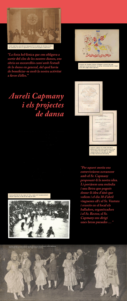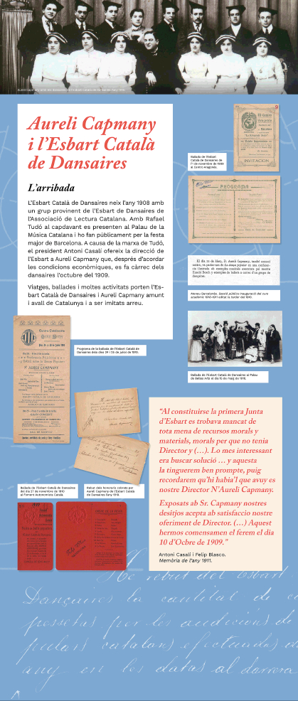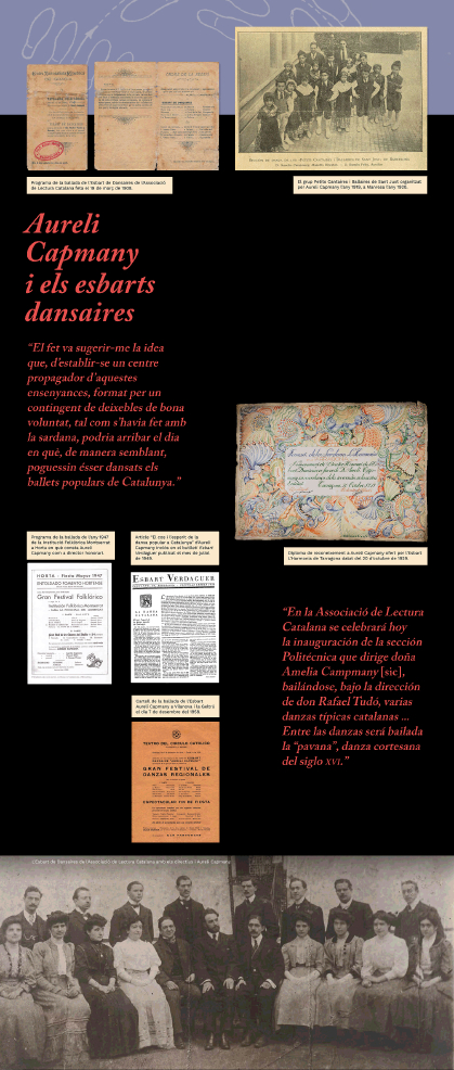 L’exposició Aureli Capmany. La Dansa i l’Esbart Català de Dansaires està composta de diversos àmbits que documenten i mostren la fascinació de Capmany per la dansa, els motius que el van apassionar per aquesta activitat, el naixement dels esbarts dansaires, les publicacions, el mestratge i els projectes relacionats amb aquesta activitats i en especial la seva petja a l’Esbart Català de Dansaires i altres associacions.