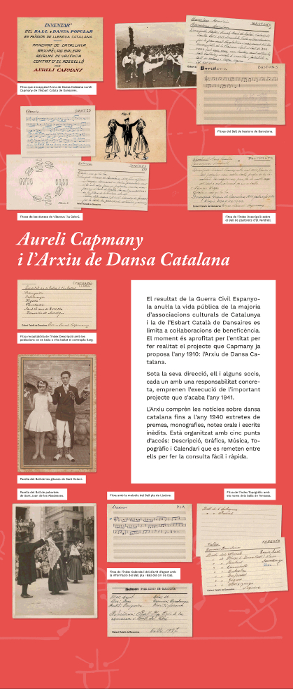 L’exposició Aureli Capmany. La Dansa i l’Esbart Català de Dansaires està composta de diversos àmbits que documenten i mostren la fascinació de Capmany per la dansa, els motius que el van apassionar per aquesta activitat, el naixement dels esbarts dansaires, les publicacions, el mestratge i els projectes relacionats amb aquesta activitats i en especial la seva petja a l’Esbart Català de Dansaires i altres associacions.
