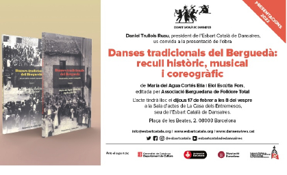 L’Esbart Català de Dansaires ha programat pel dia 17 de febrer a les 8 del vespre la presentació de l’obra Danses tradicionals del Berguedà : recull històric, musical i coreogràfic dels autors María del Agua Cortés Elía i Eloi Escútia Fors, membres de l'Associació Berguedana de Folklore Total, una nova sessió de Presentacions 2022.