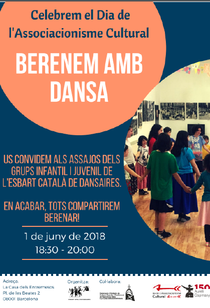 Berenem amb dansa a la Secció Juvenil. Assaig obert, mostra de danses a la Secció Juvenil, amb lectura de fragments d’obres d’Aureli Capmany, i berenar. Lloc: Sala de Ball de La Casa dels Entremesos.