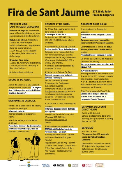 Amb motiu de la Fira de Sant Jaume que es celebra a Prats de Lluçanès es podrà visitar l’exposició De pagès a típic: 100 anys dels vestits de l’Esbart Català de Dansaires a la Sala de Cal Bach, seu de l’Ajuntament. L’acte d’inauguració està previst pel dia 25 de juliol, a les 20h, i es podrà visitar fins el dia 4 d’agost, els dies feiners en horari d’oficina i els cap de setmana de 10 a 14h.