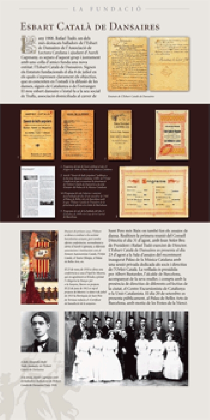 Consta de deu apartats en deu plafons autoenrotllables que repassen els objectius i les activitats de l’Esbart Català de Dansaires des de la fundació. S’il·lustren amb documents, fotografies, gràfics, etc.